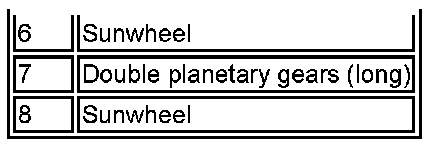 Sunwheel 2 is driven via clutch 'B' which is engaged. The long planetary gears, which are also meshed with the short planetary gears, cannot roll around the fixed sunwheel 2 and transmit drive to the locked double web planetary gear train carrier in the direction of engine rotation.
