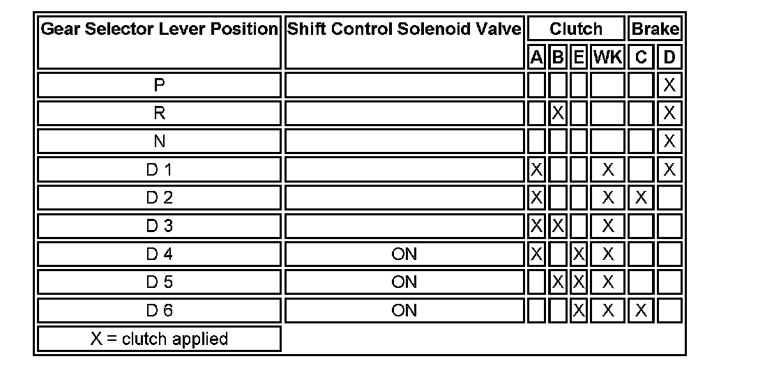 The following table shows which clutches are operating for selected gear ratios to produce the required torque output from the transmission.