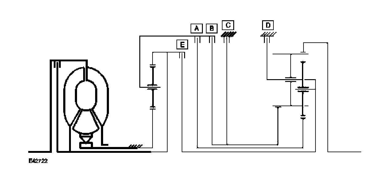 The shift elements are three rotating multiplate clutches (A, B and E) and two fixed multiplate brakes @ and D). All shifts from 1st to 6th gears are power-on overlapping shifts. Overlapping shifts can be described as one of the clutches continuing to transmit drive at a lower main pressure until the next required clutch is able to accept the input torque.