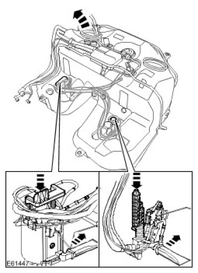 ^ Depress the clips and release the lower part of the pump and sender unit rearward.