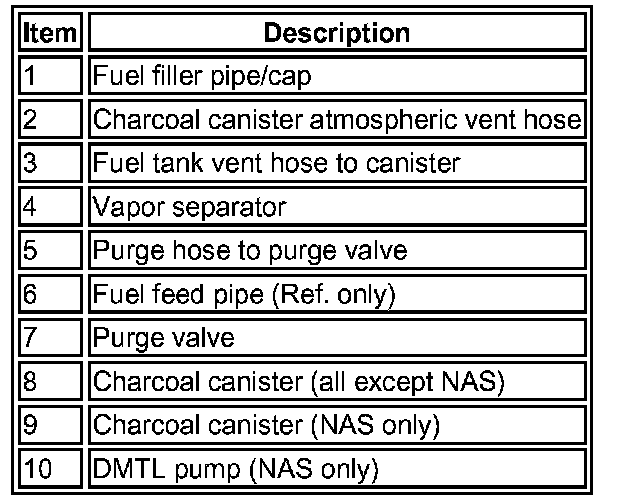 When the purging process is active, fresh air is drawn into the charcoal canister via the DMTL valve atmospheric vent connection and its filter on NAS vehicles or, via the vent hose connection and the spider trap on non NAS vehicles.