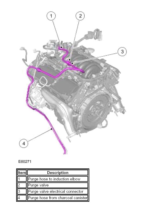 The purge hose is routed from the purge valve, along the top of the left hand rocker cover to a quick release coupling. From the coupling, the hose is routed down the left hand side of the engine compartment to the purge line which runs parallel with the fuel feed line along underside of the vehicle and across the top of the fuel tank to the charcoal canister.