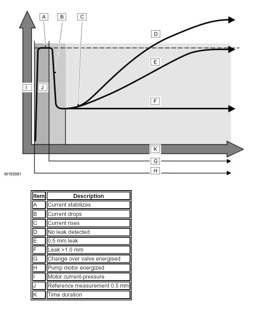 To check the fuel tank and the EVAP system for leaks, the ECM operates the DMTL pump and monitors the current draw. Initially, the ECM establishes a reference