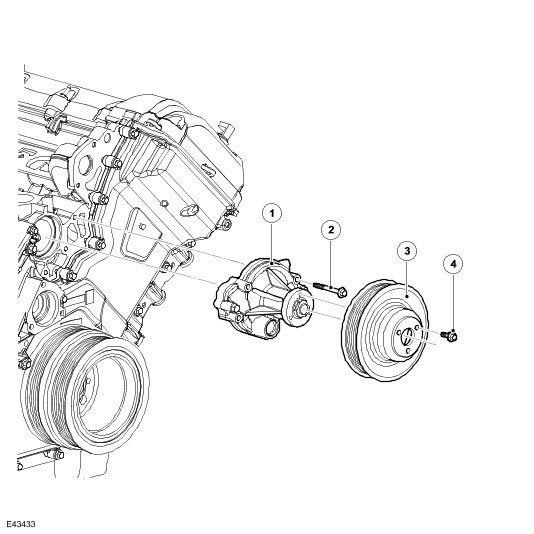 The coolant pump is installed between the two cylinder banks, on the front face of the cylinder block.