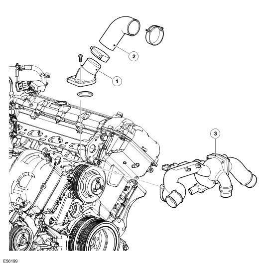 To accommodate the installation of the supercharger, the thermostat housing and coolant outlet duct are combined into an aluminum alloy coolant outlet assembly, which is installed between the two cylinder banks, immediately above the coolant pump. A hose connects the coolant outlet assembly to a coolant inlet housing attached to the coolant pump intake on the cylinder block. The thermostat controls the flow of coolant through the radiator.