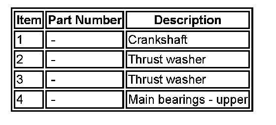 The main bearings are aluminum/tin split plain bearings. An oil groove in the upper half of each bearing transfers the oil into the crankshaft for lubrication of the connecting rod bearings. An aluminum/tin thrust washer is installed each side of the top half of the center main bearing.