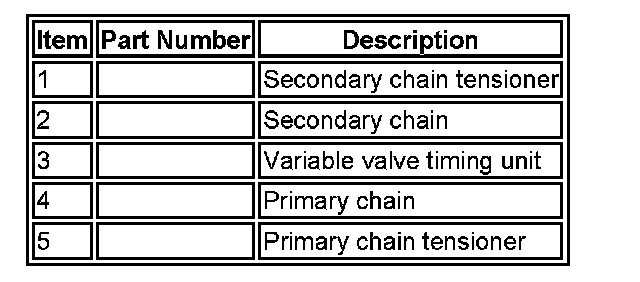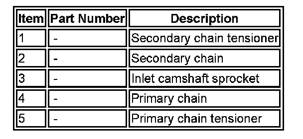 Multiple link primary and single row secondary chains drive the camshafts of each cylinder bank. The primary chains transmit drive from two sprockets on the crankshaft to each intake camshaft sprocket. The secondary chains transmit drive from the intake camshaft sprockets to the exhaust camshafts.