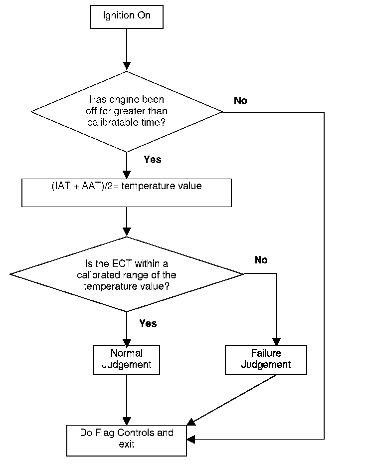 If the engine has been off for greater than a calibrated time, then the ECT sensor reading is compared to the average reading of the sum of the intake air temperature (IAT) and ambient air temperature (AAT) sensors. The ECT sensor must be within a calibrated threshold of this value for a normal judgement to be made, otherwise a fault will be detected.