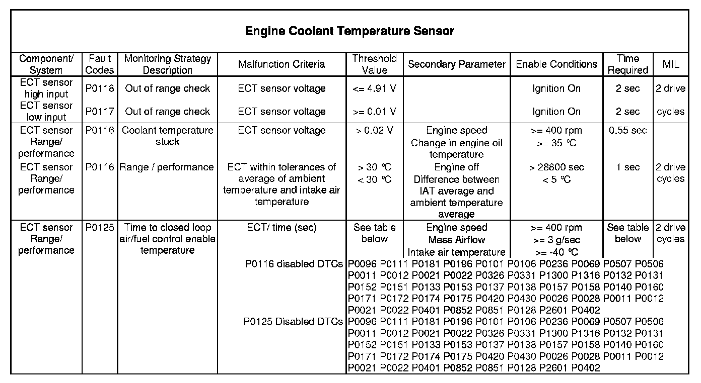 The monitor checks that the ECT sensor is reading a correct value when compared to other temperature sensors on the vehicle at ignition on.