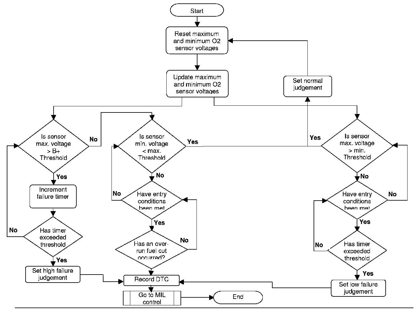 The stuck diagnostic is designed to detect if the downstream oxygen sensor voltage is permanently at a voltage that is within its normal operating range. If the entry conditions are met and that the fuel system and oxygen sensors are in working order, the downstream oxygen sensor maximum and minimum voltages are continuously updated. After a fuel-cut has been performed, the difference in voltages before and after the fuel cut is compared. If the difference has not exceeded a threshold then a fault code will be stored.