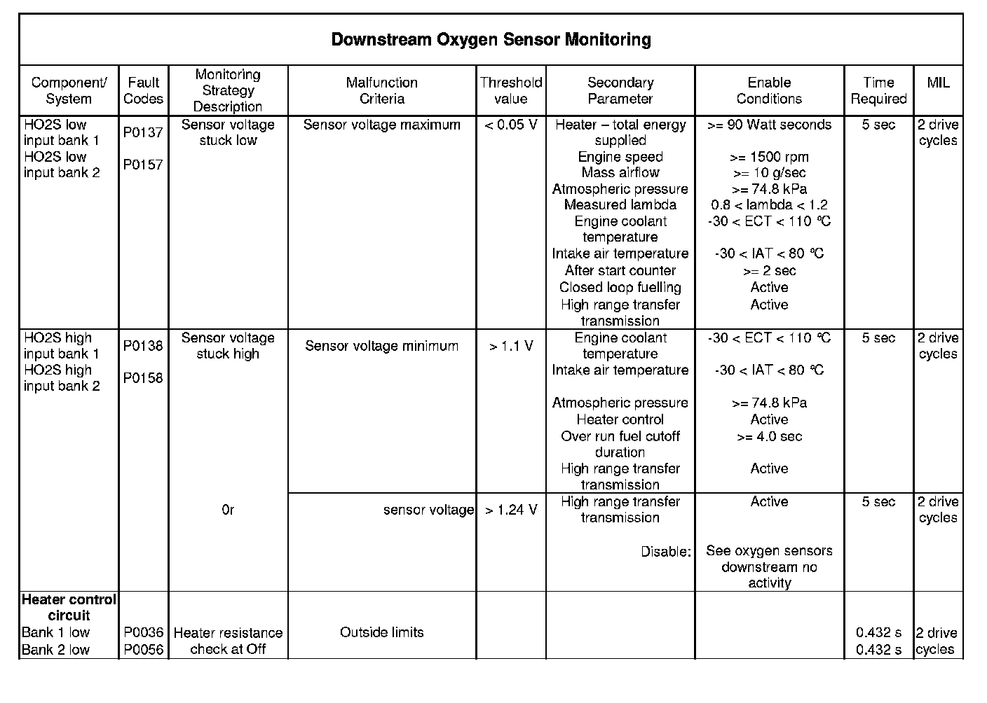 If the above table does not include details of the following enabling conditions: - IAT, ECT, vehicle speed range, and time after engine start-up then the state of these parameters has no influence upon the execution of the monitor.