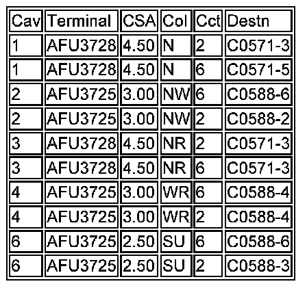 ^ Wire Chart (Pin-out table) - A six column table, giving details of each wire within the connector:
