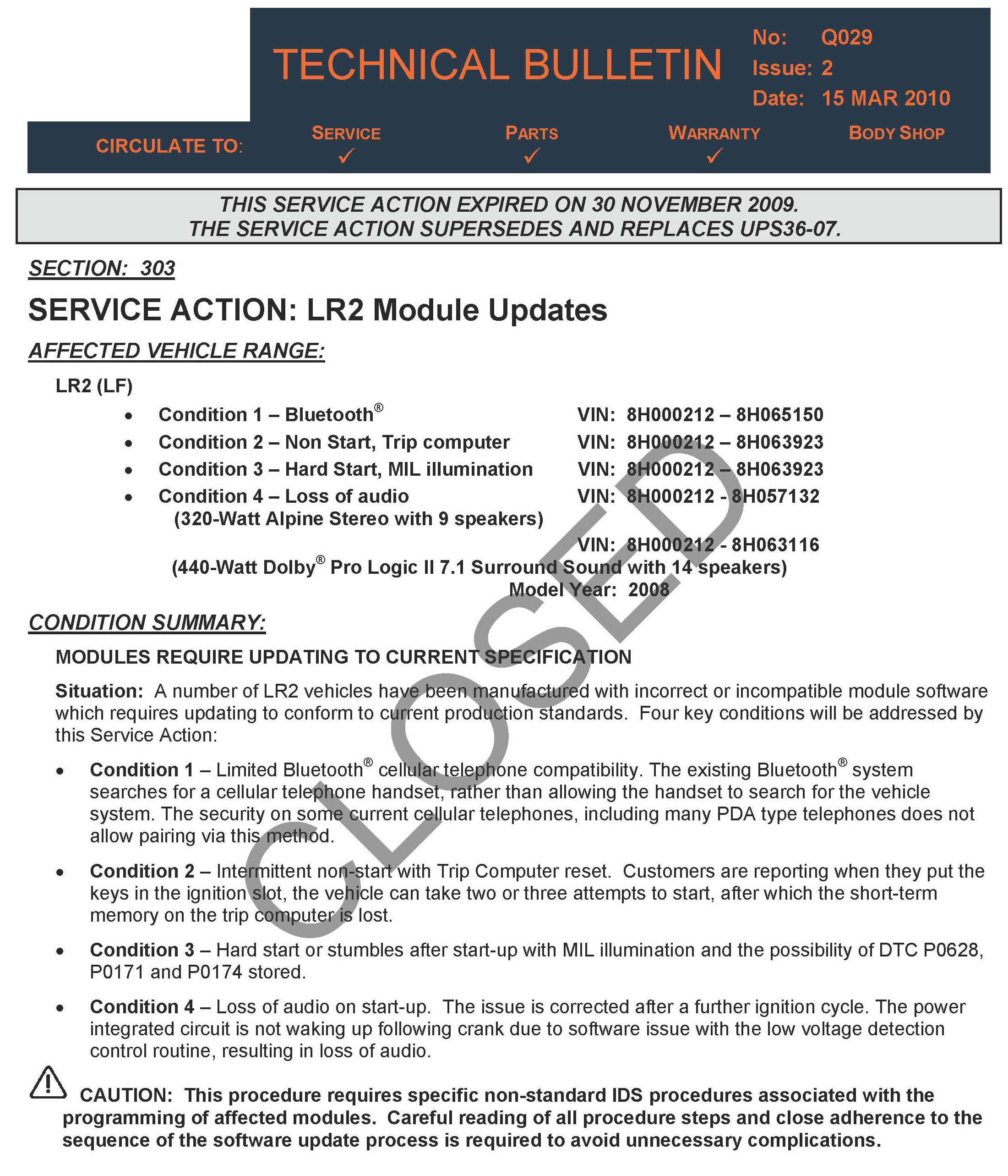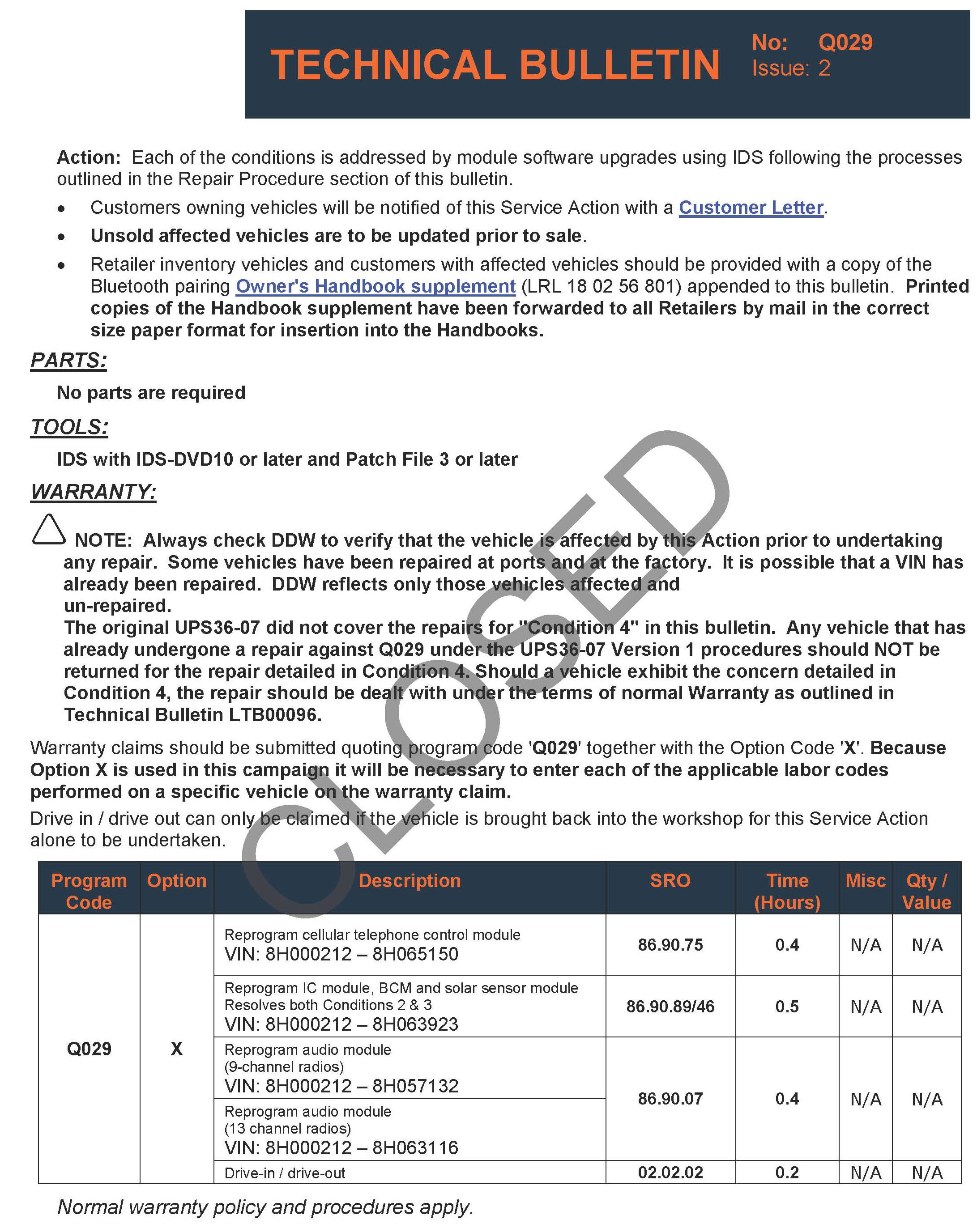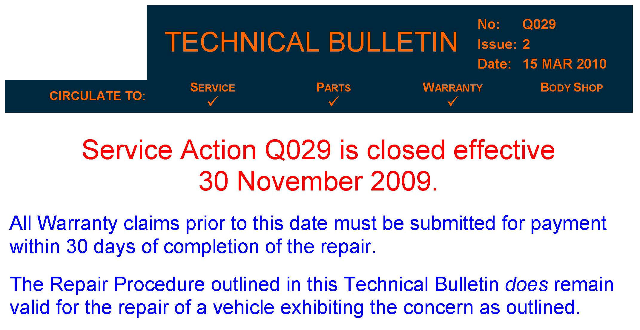 Campaign Q029 - CLOSED/Repair Procedure Still Valid