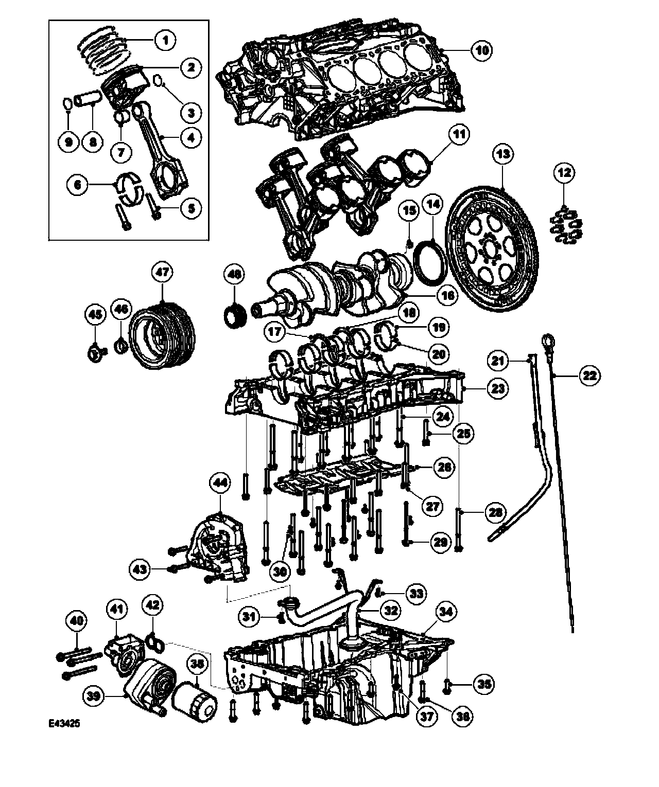The cylinder block is an �Enclosed V design, which provides an inherently rigid structure with good vibration levels. A low volume coolant jacket improves warm-up times and piston noise levels, the longitudinal flow design of the jacket, with a single cylinder head coolant transfer port in each bank, improves rigidity and head gasket sealing. The right hand cylinder bank is designated as bank 'A' (cylinders 1 to 4), and the left hand as bank 'B' (cylinders 5 to 8).