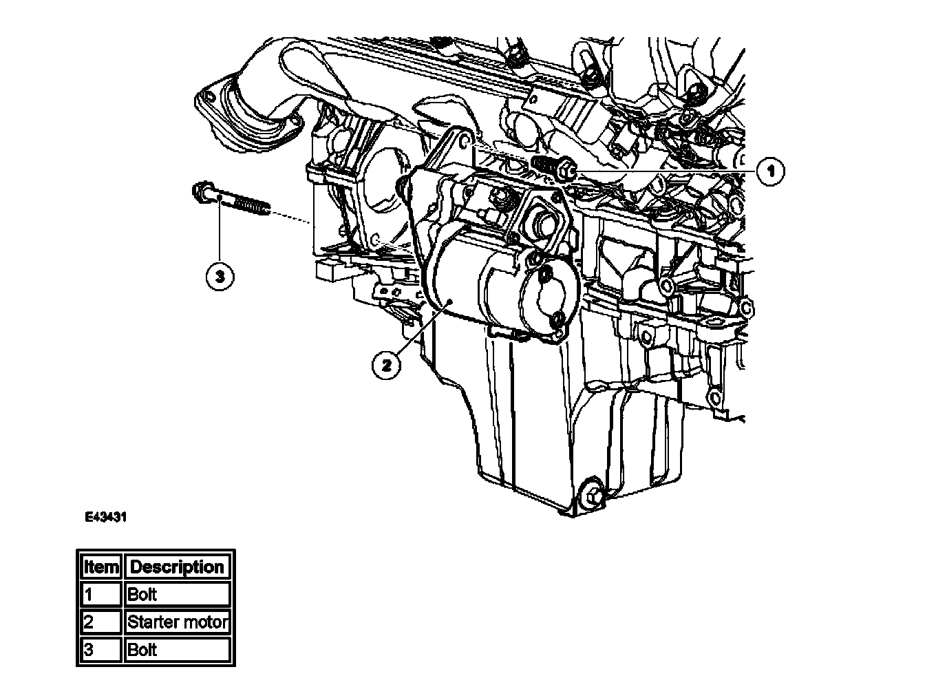 The engine starter motor is installed at the rear right side of the engine, at the cylinder block to bedplate split line.