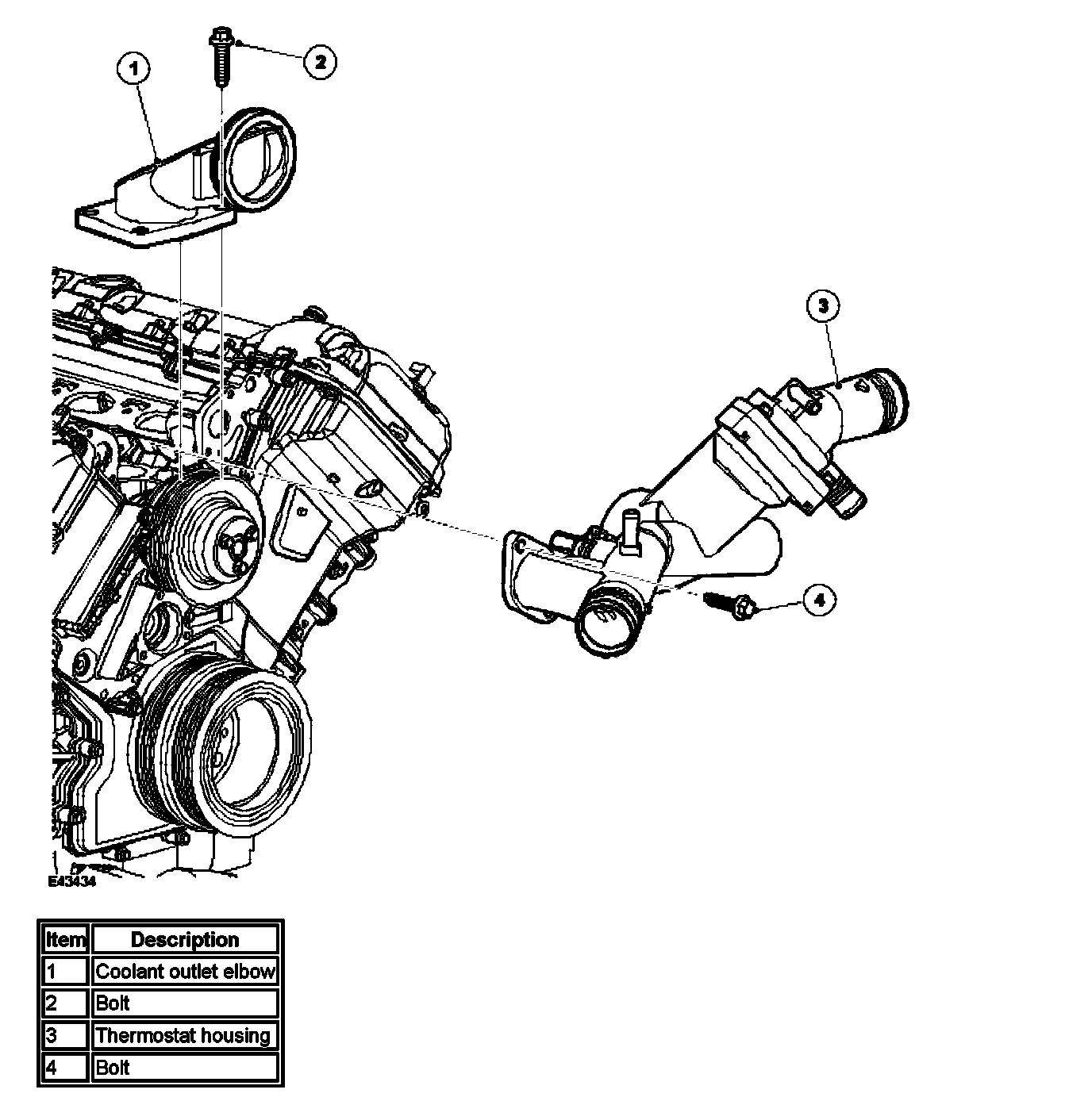 The composite thermostat housing is installed between the two cylinder banks, immediately above the coolant pump. The thermostat controls the flow of coolant through the radiator.