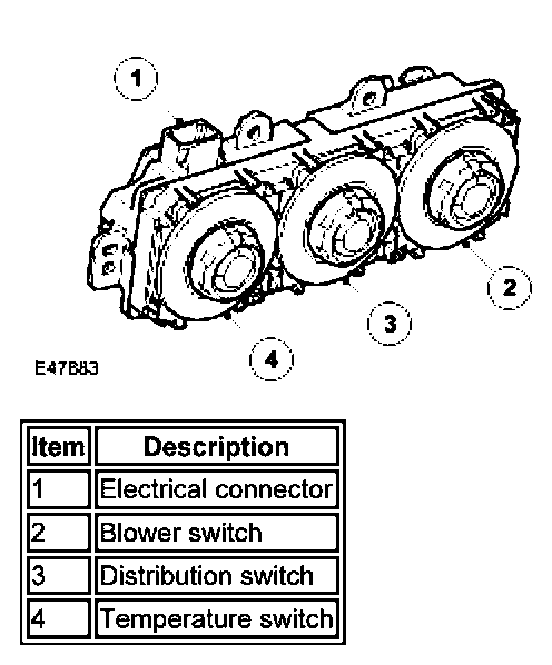 The ACCM allows manual adjustment of the output from the auxiliary climate control assembly. The ACCM is installed in the headliner immediately behind the row 2 interior lamp. An integral control panel contains separate rotary switches for temperature, distribution and blower speed. When the ACCM is in manual mode, amber LED's in the switch surrounds illuminate to indicate the current settings of the system and function symbols in the switch surrounds are illuminated when the side lamps or headlamps are on.