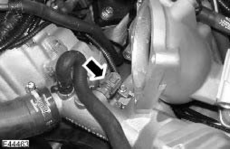 ^ Position the engine gas recirculation (EGR) coolant hose aside for access.