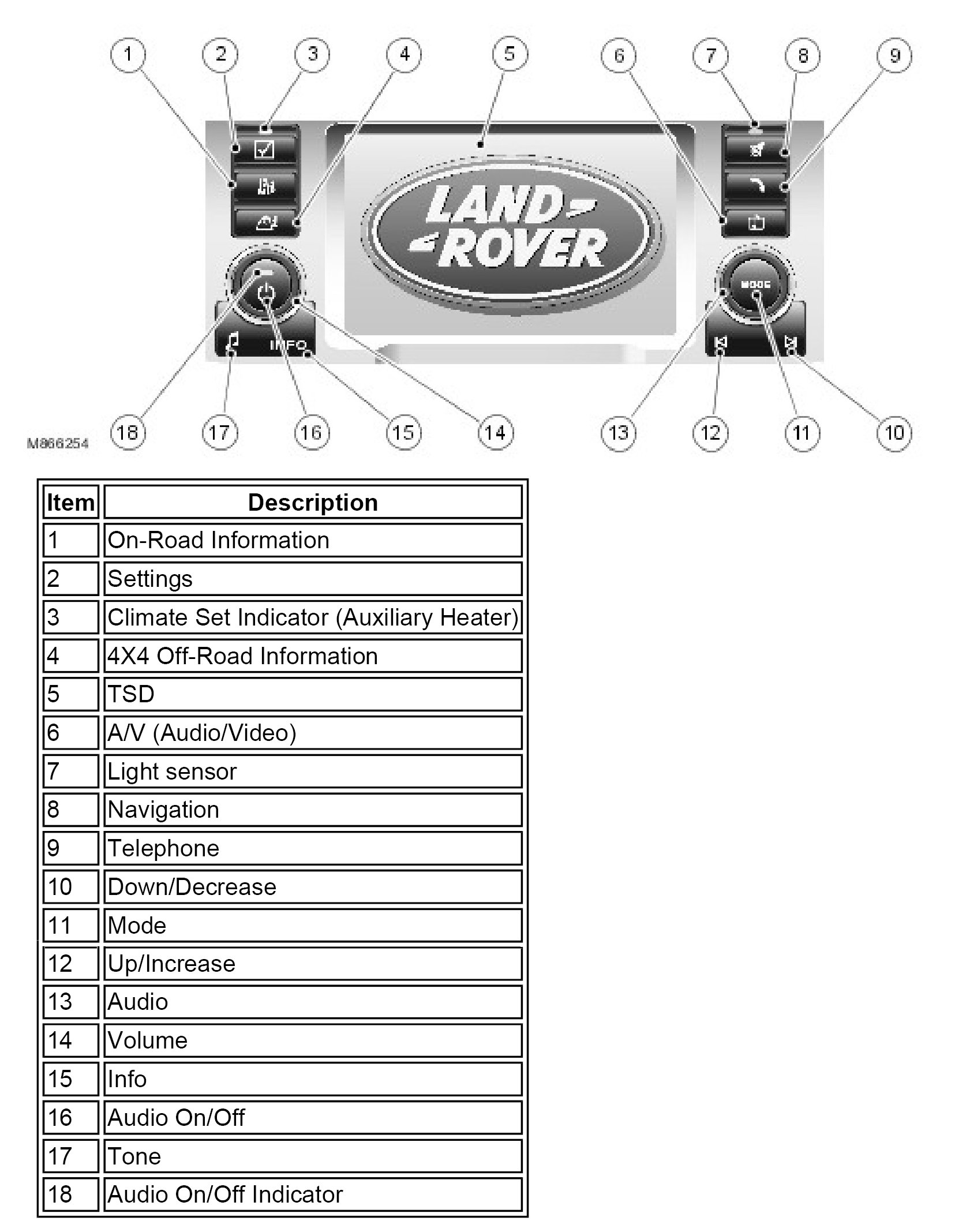^ The TSD physical buttons and the touch screen virtual icons can be tested using the TSD diagnostics detailed in the Audio System section. Navigation system fault codes can also be accessed from the TSD diagnostics where Dens-and the corresponding Land Rover codes are displayed.