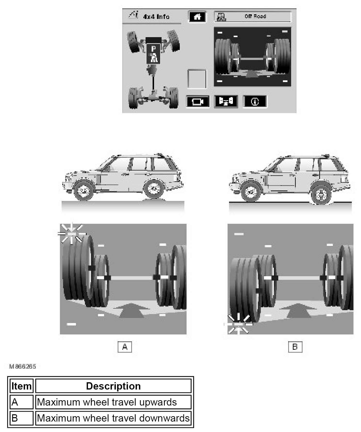 The position of each wheel relative to the vehicle body is displayed. Upper and lower wheel travel markers are shown as white lines above and below each wheel. The positions of the wheel markers move according the air suspension height selected. When the suspension is at off-road height, the position of the travel markers move upwards to represent the 55 mm of vehicle body movement when in this mode. When the suspension is at access height, the position of the travel markers move downwards to represent the 50 mm of vehicle body movement when in this mode. When the suspension is in off-road or access height, the positions of the suspension and wheel travel markers are displayed as blue lines to show their relative positions in standard height mode.