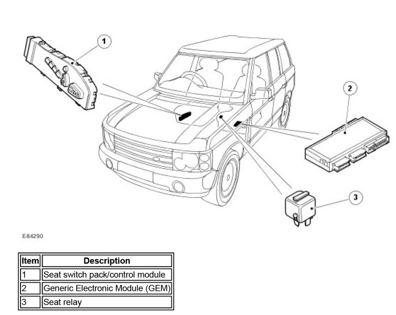 The switches for electrically adjusting the seats are located in the seat pack on the seat valance. The seat module is integral to the switch pack and controls the movement of the seat via hard-wired connections to the motors.