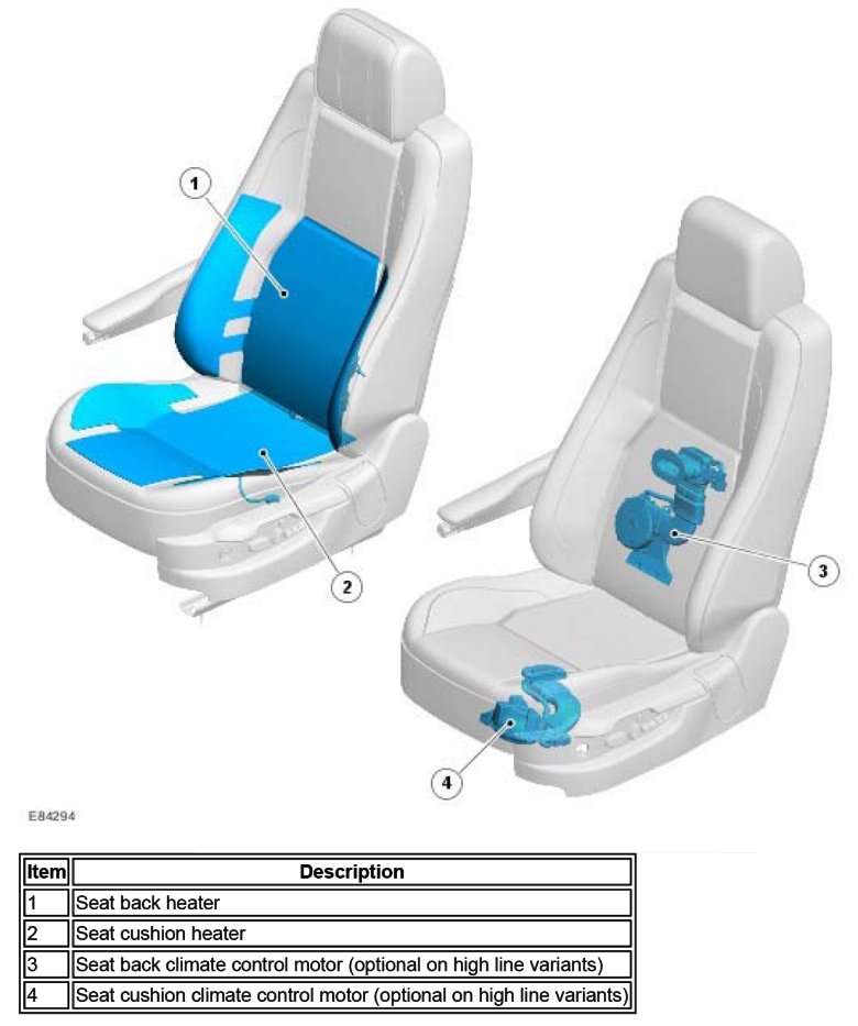 High specification vehicles are fitted with climatic seats, which are able to deliver heating and cooling to the front seat occupants. Vehicles fitted with climatic seats feature 2 additional rotary controllers mounted in the instrument panel switch pack, adjacent to the clock. The rotary controllers are used to select cooling. Three levels of cooling and heating are available, dependant on the degree of switch rotation. The center of the switch is pressed once to ventilate both the seat back and cushion (both indicators on the switch will illuminate). A second press of the switch will ventilate the seat back rest only (the cushion indicator will extinguish).
