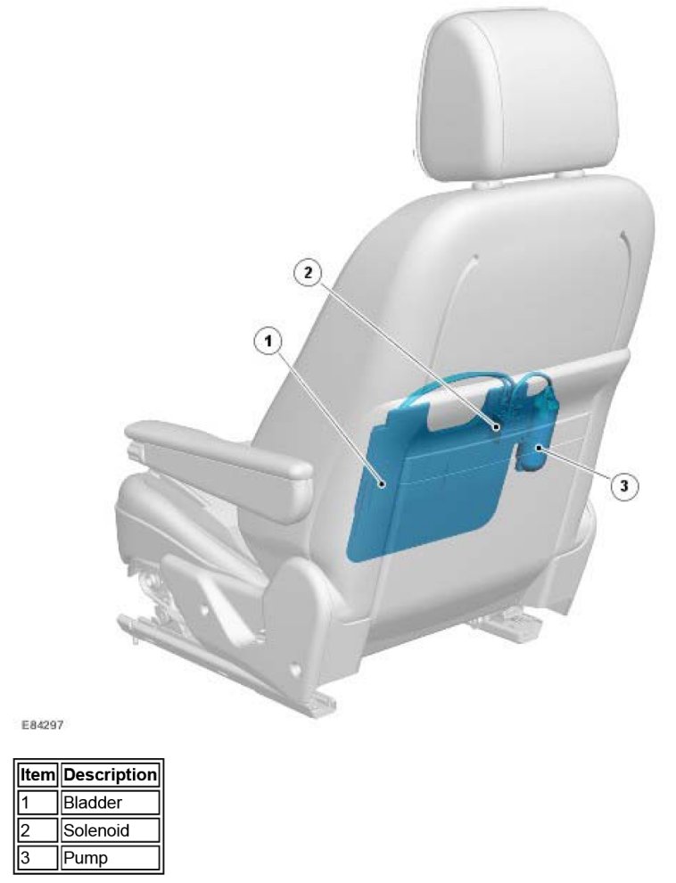 The lumbar pump inflates a bladder in the backrest, which provides extra support for the seat occupant. With no load on the seat it takes approximately 10 seconds to completely inflate the bladder. With a load of 25 kg (55 lb) it takes approximately 15 seconds to inflate the bladder. A pressure cut off switch in the system will operate at 0.12 to 1.93 bar (1.8 to 28 lbf.sq.in). The lumbar bladder can be replaced independently of the pump. The components are not serviceable.