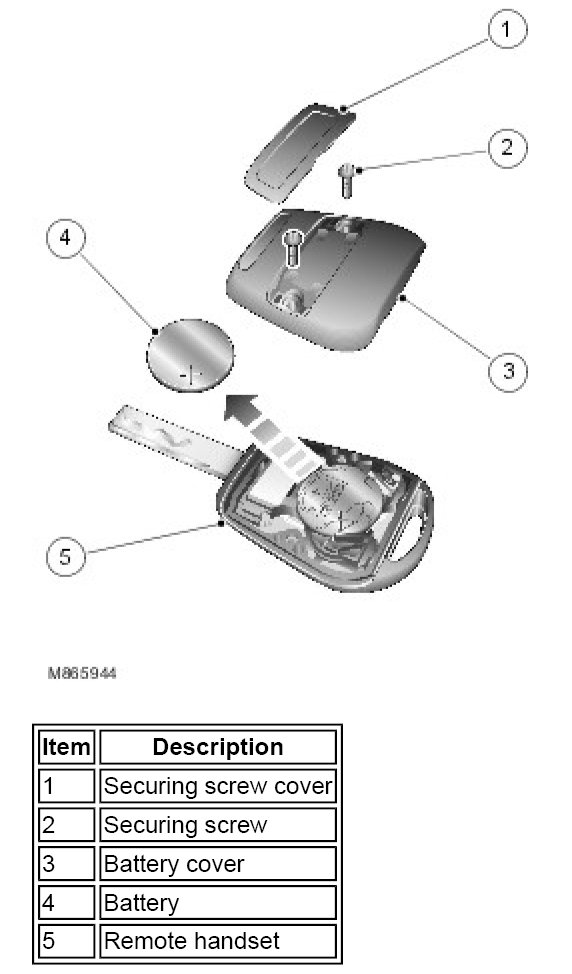 The power supply in the remote handset on vehicles up to 2007MY is provided by a single button cell battery on RF systems and two button cell batteries on infrared systems. When the batteries need replacing the message 'KEY BATTERY LOW' will be displayed in the message center. When the batteries are replaced, the old ones should be removed and the new ones installed within 1 minute or stored data will be lost and the remote handset will need to be reinitialized.