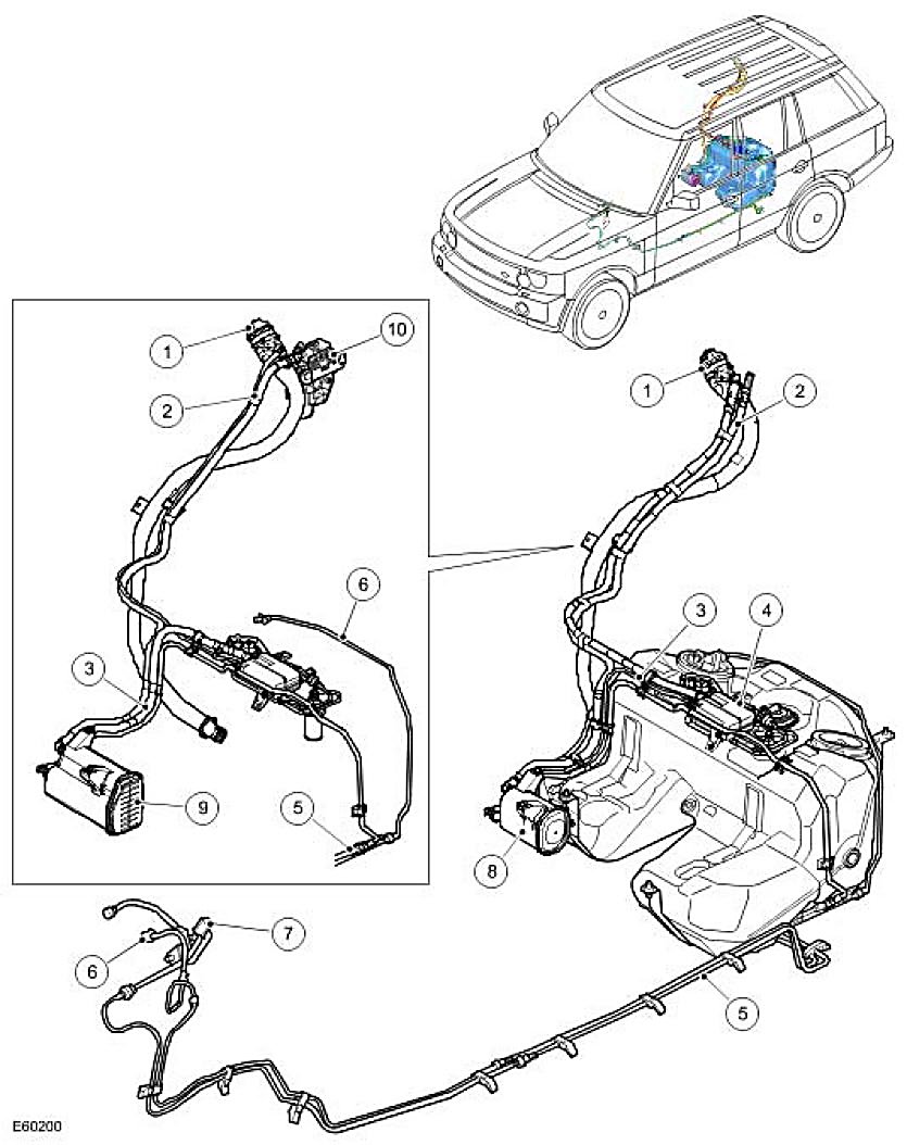 The purge hose is routed from the purge valve, along the top of the left hand rocker cover to a quick release coupling. From the coupling, the hose is routed down the left hand side of the engine compartment to the purge line which runs parallel with the fuel feed line along underside of the vehicle and across the top of the fuel tank to the charcoal canister.