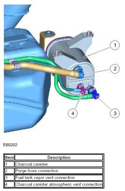 When the purging process is active, fresh air is drawn into the charcoal canister via the DMTL valve atmospheric vent connection and its filter on NAS vehicles or, via the vent hose connection and the spider trap on non NAS vehicles.