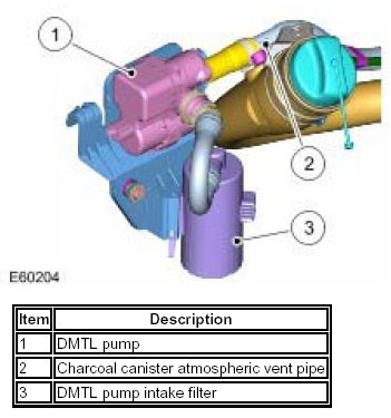 The DMTL pump is located at the top of the fuel filler pipe, on a bracket near to the filler neck. The pump is connected by a pipe to the atmospheric vent of the charcoal canister and incorporates a Positive Temperature Co-efficient (PTC) heating element, a normally open valve and a reference orifice. The DMTL pump is only operated when the ignition is switched off and is controlled by the ECM. The ECM also monitors the electric air pump operation and the normally open valve for faults.