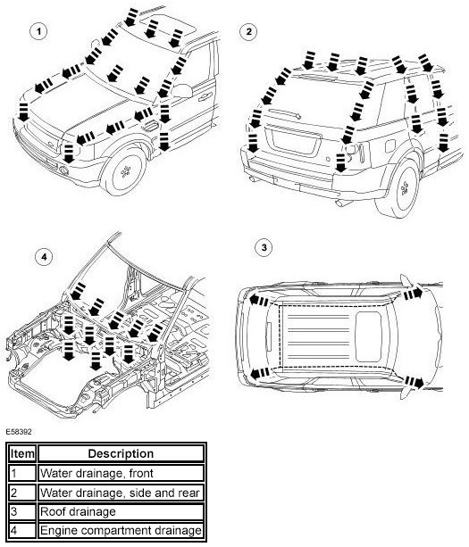 ^ Visual Inspection The following characteristics may indicate existing leaks: Check the clearance and accurate fit of ancillary components such as the hood, tailgate, liftgate, doors, and so on. Check for correct fit and possible damage to sealing elements such as blanking plugs, rubber door seals, and so on. Check water drain holes for unhindered flow.