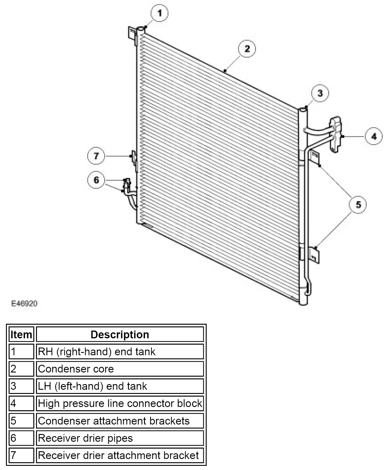 The condenser is classified as a sub-cooling condenser and consists of a fin and tube heat exchanger core installed between two end tanks. Divisions in the end tanks separate the heat exchanger into a four pass upper (condenser) section and a two pass lower (sub-cooler) section. A connector block on the left end tank of the condenser provides connections for the high pressure lines from the A/C (air conditioning) compressor and the evaporator. Two pipes at the bottom of the right end tank of the condenser provide connections for the receiver drier.