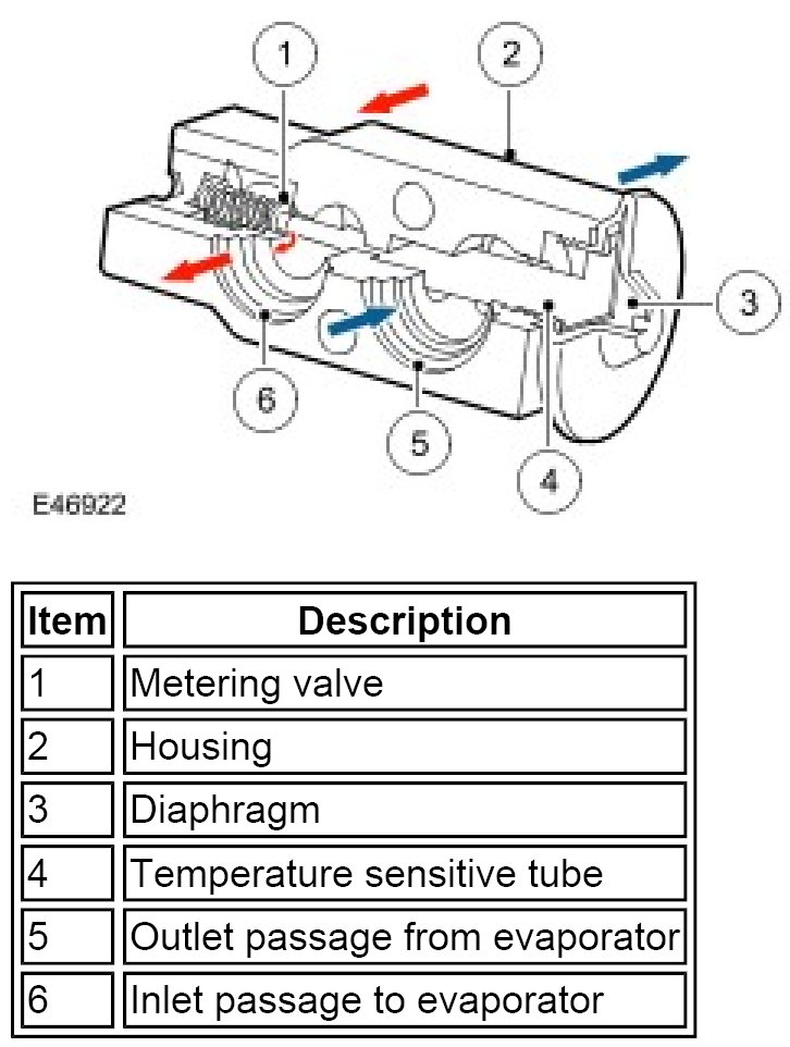 The temperature and pressure of the refrigerant leaving the evaporator act on the diaphragm and temperature sensitive tube, which regulate the metering valve opening and so control the volume of refrigerant flowing through the evaporator. The warmer the air flowing through the evaporator, the more heat available to evaporate refrigerant and thus the greater the volume of refrigerant allowed through the metering valve.