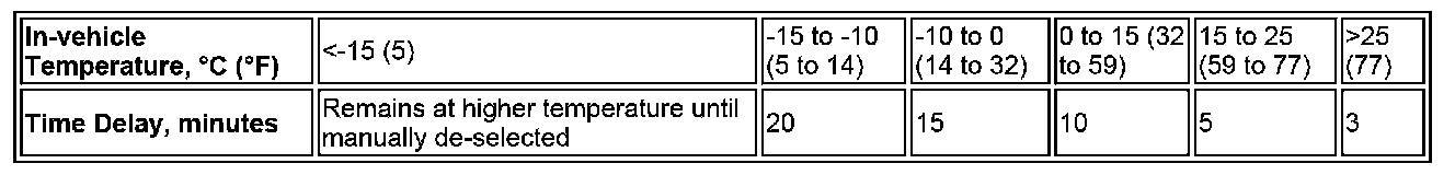 When the front seat heaters are activated at the higher temperature setting, the ATC (automatic temperature control) module automatically resets them to the lower temperature after a time delay. The length of the time delay depends on the in-vehicle temperature.