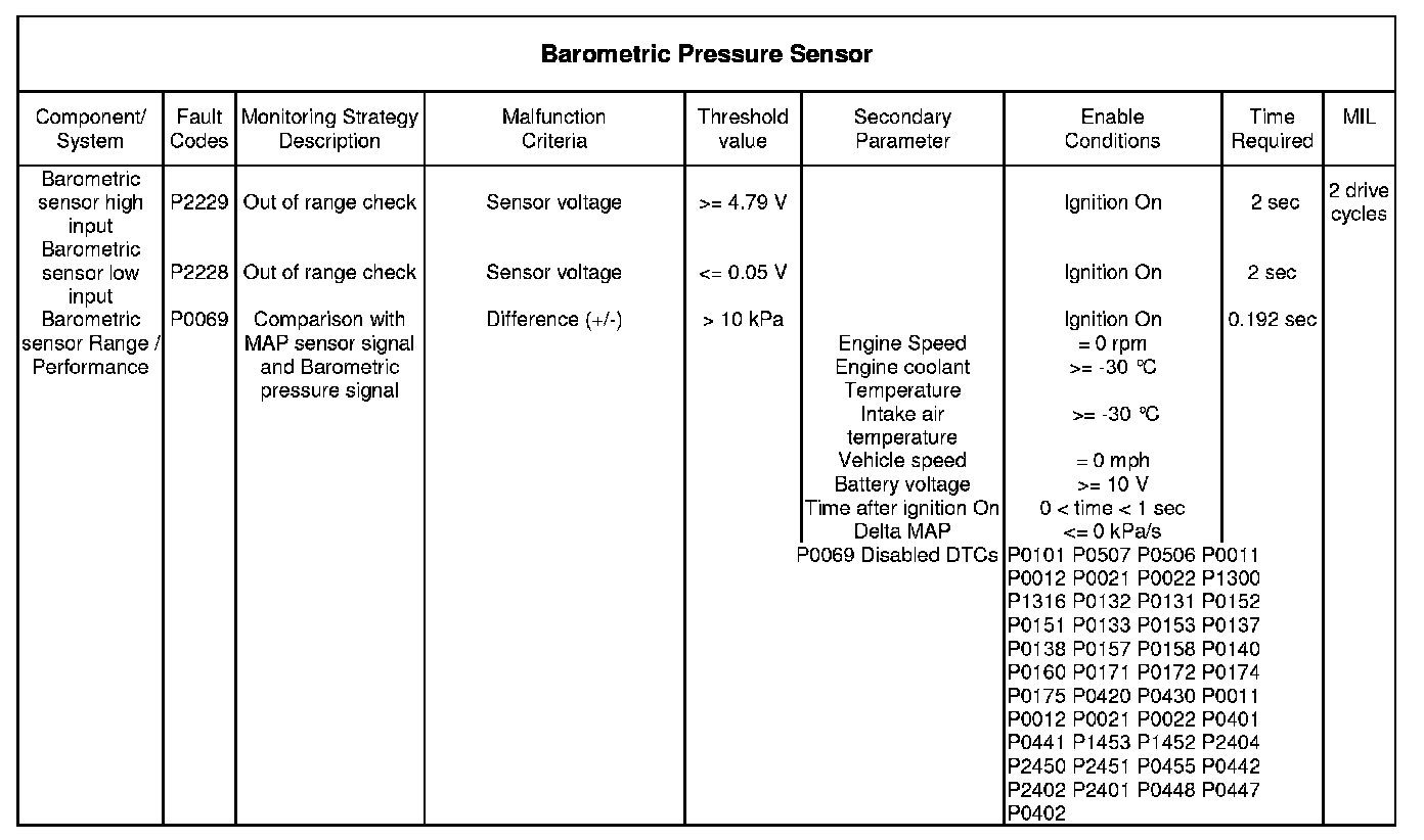 The signal from the sensor is compared to the signal from the Manifold Absolute Pressure sensor (MAP) at ignition on only. During this time the pressure within the inlet manifold should be at atmospheric, and therefore should match the value from the barometric pressure sensor.