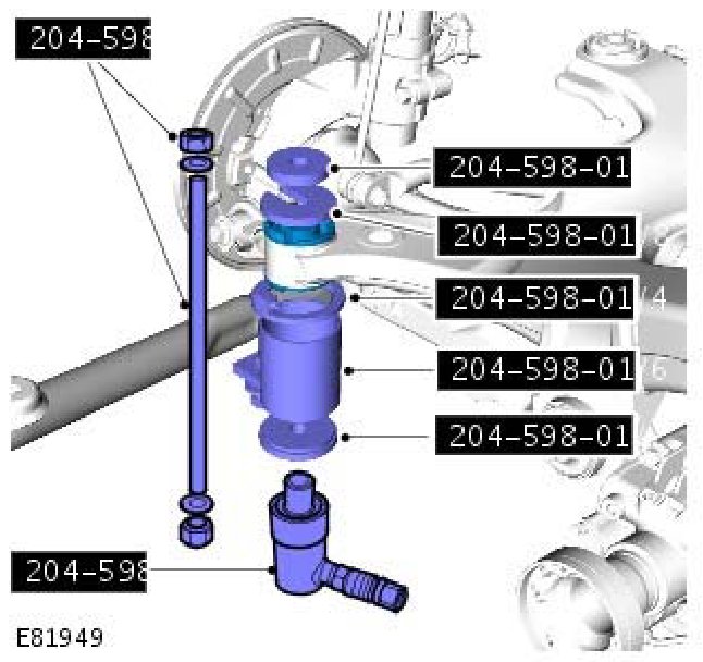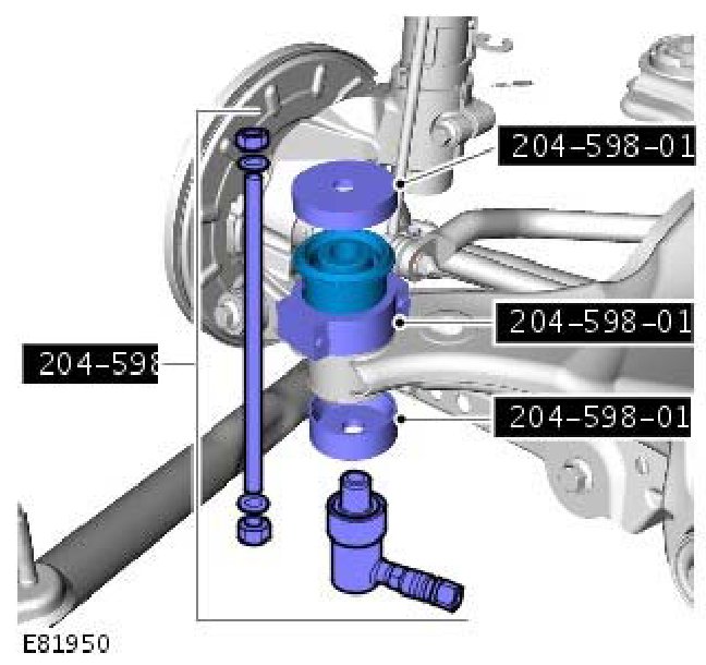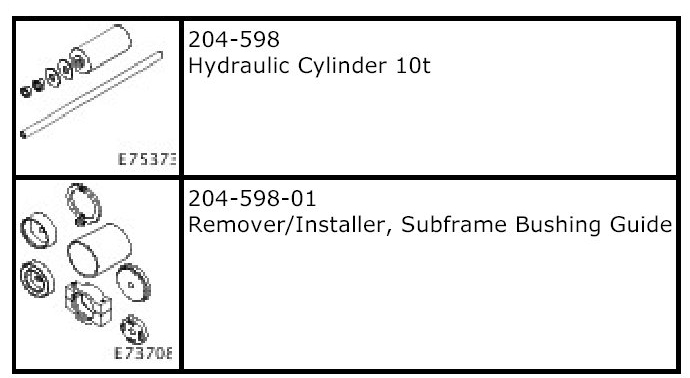 - Special tool 204-598-01/8 is used to start the bushing removal process, and must be removed after the bushing has released, as it will not pass through the subframe bushing aperture.