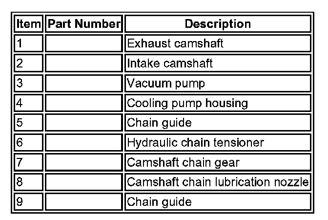 The timing chain is driven by the camshaft chain gear via the crankshaft. The chain drives both the intake and exhaust camshafts. The chain is continually tensioned by a hydraulic chain tensioner and is lubricated by oil via a separate nozzle.