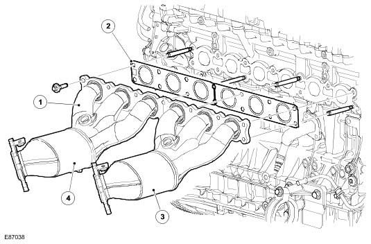The exhaust manifold comprises 2 separate manifold assemblies. One manifold is used for cylinders 1 to 3 and the second manifold is used for cylinders 4 to 6. The manifolds are sealed to the cylinder head with a gasket and secured with 14 bolts.