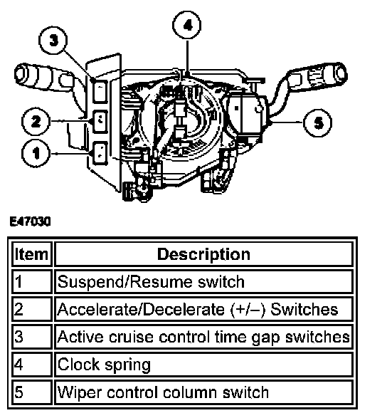 The speed control switches are located on the LH side of the steering wheel. The switches are connected via fly leads directly to the clock spring. All of the speed control switches are non-latching momentary rocker switches. The minimum set speed for speed control is 18 mph (30 (km/h). Speed control is automatically suspended if the vehicle speed falls below 15 mph (24 km/h).