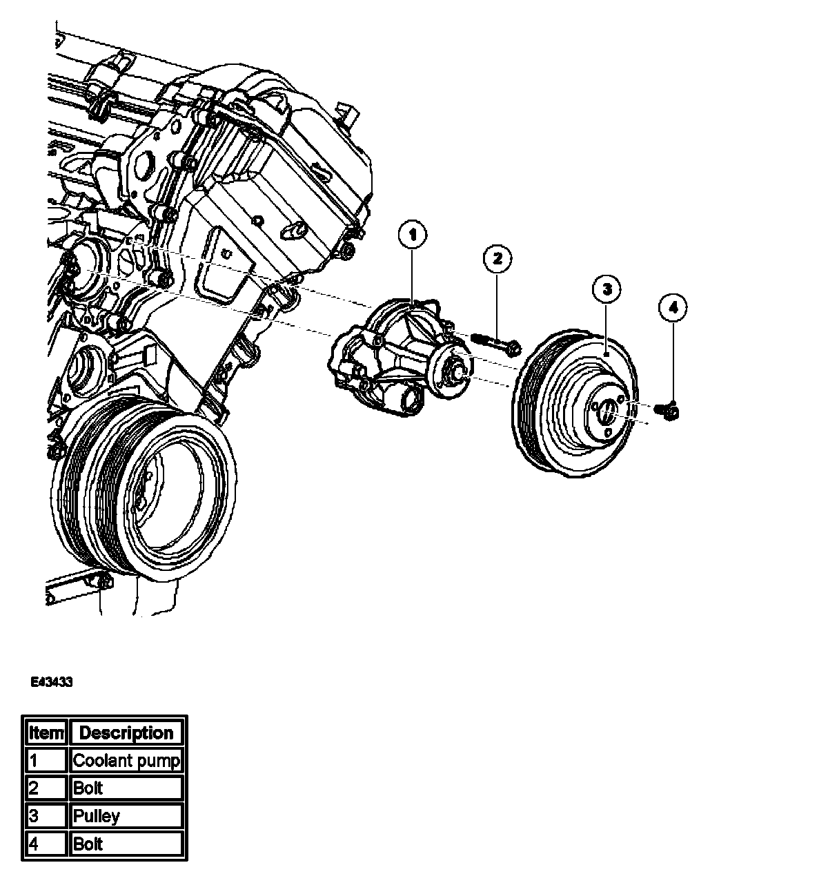 The coolant pump is installed between the two cylinder banks, on the front face of the cylinder block.
