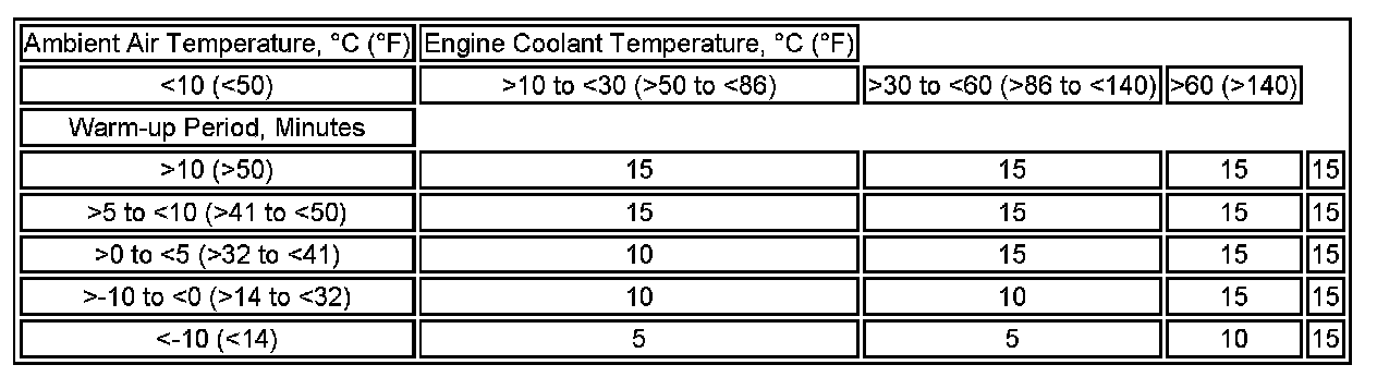 ^ The hot start table is used when the ambient air temperature is 5 degree C (41 degree F) or more and the engine coolant temperature is less than 30 degree C (86 degree F).