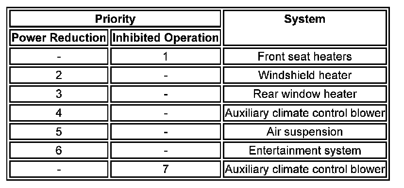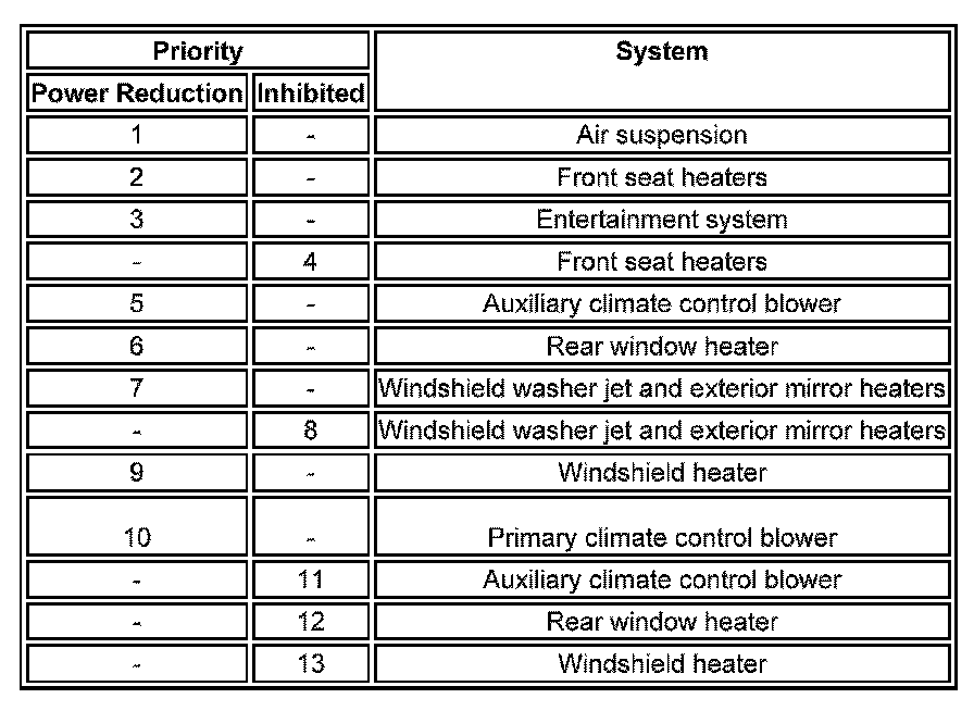 If the electrical load is more than the maximum load available, the ATCM requests an increase of engine idle speed using the medium speed CAN bus message to the ECM. If an electrical load imbalance remains after an increase in engine idle speed, or if the electrical load is more than the capacity of the charging system, the ATCM reduces the electrical load by reducing the power of some vehicle systems or inhibiting their operation. The number of systems controlled depends on the electrical load reduction required. The systems controlled, and the order in which their power is reduced or they are inhibited, are contained in three priority tables. The table used depends on the ambient air temperature, battery temperature and engine coolant temperature: