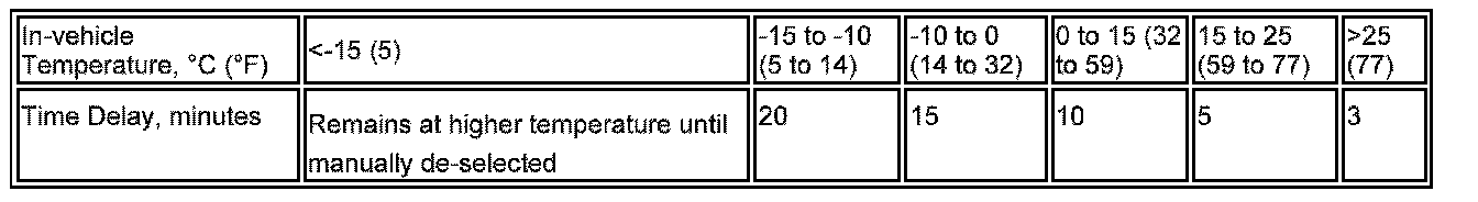When the front seat heaters are activated at the higher temperature setting, the ATCM automatically resets them to the lower temperature after a time delay. The length of the time delay depends on the in-vehicle temperature.