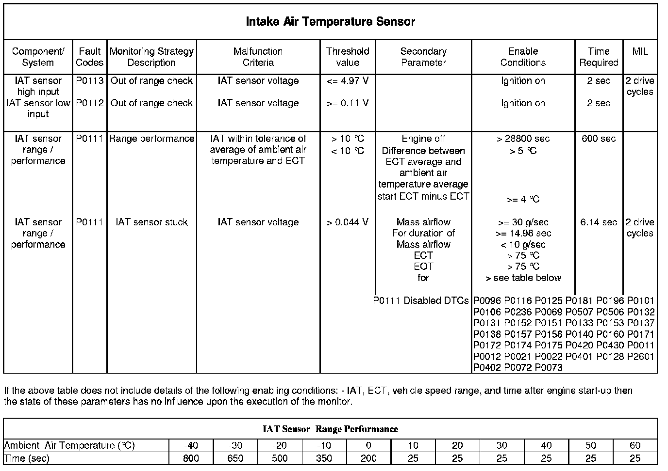 The monitor checks that the IAT sensor is reading a correct value when compared to other sensors on the vehicle.