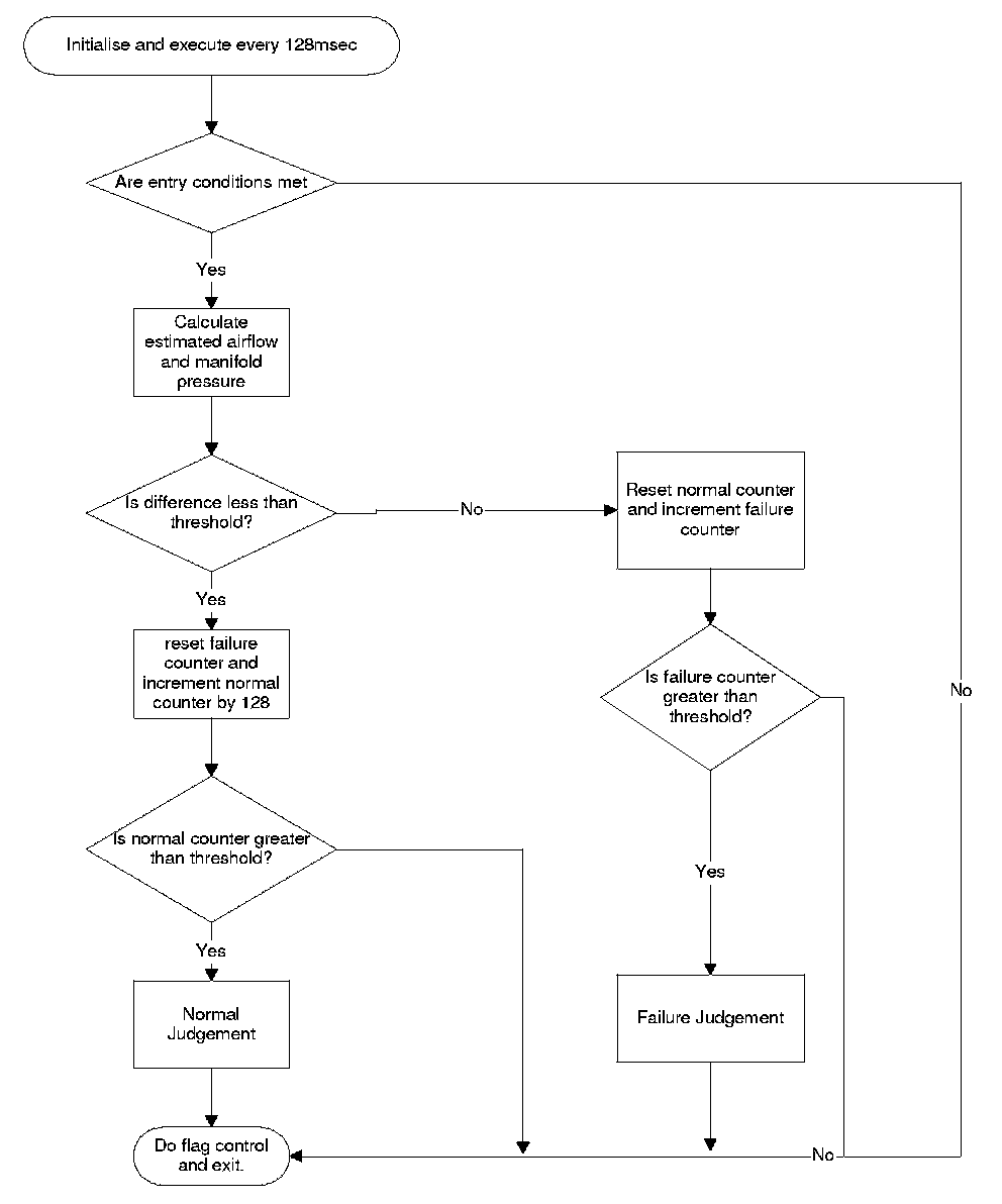 Judgements of whether the MAF sensor is behaving correctly are made after the entry conditions have been fulfilled and the differences between the measured and estimated values are below calibrated thresholds. The MAF sensor is faulty if when the entry conditions are met, the difference between the actual and estimated values is greater than a calibrated threshold. The monitor has the ability to make a normal judgement followed by a failed judgement or vice versa as the monitor runs continuously whilst the entry conditions are met.