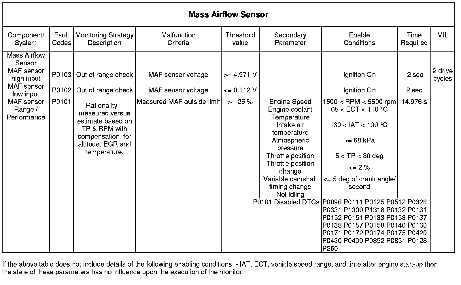 The monitor runs continuously so long as the entry conditions are met. The MAF sensor monitor compares the measured airflow with an estimated airflow, which is calculated by a model. The model that calculates the estimated airflow uses a look-up table which has engine speed and throttle angle as inputs. These are used to derive base and compensation values for intake air temperature, atmospheric pressure, EGR rate and VVT, from which the estimated airflow is calculated.