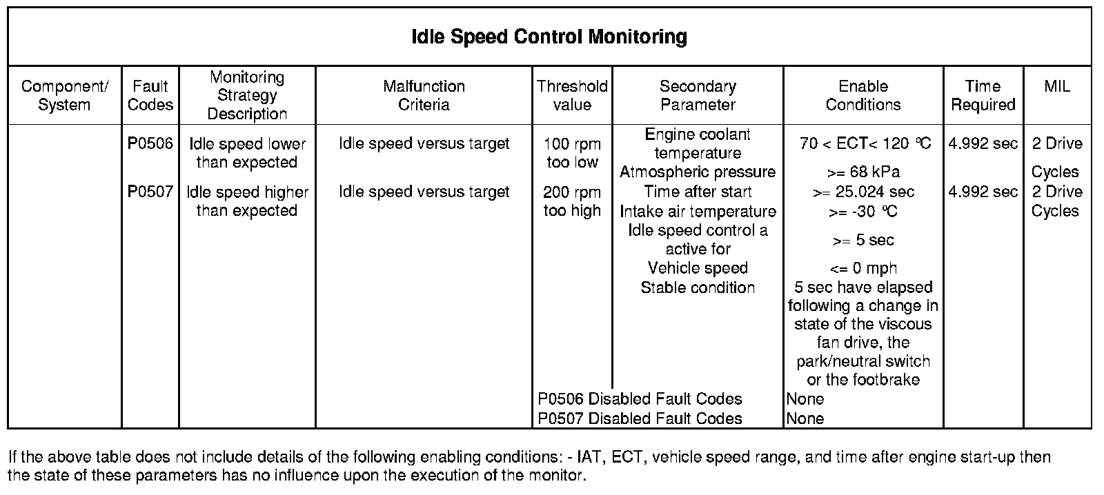 If the actual engine speed more than 100 rpm lower than the target engine speed then a counter is started and once this exceeds the failure time limit a failure judgement is made for idle speed lower than expected.