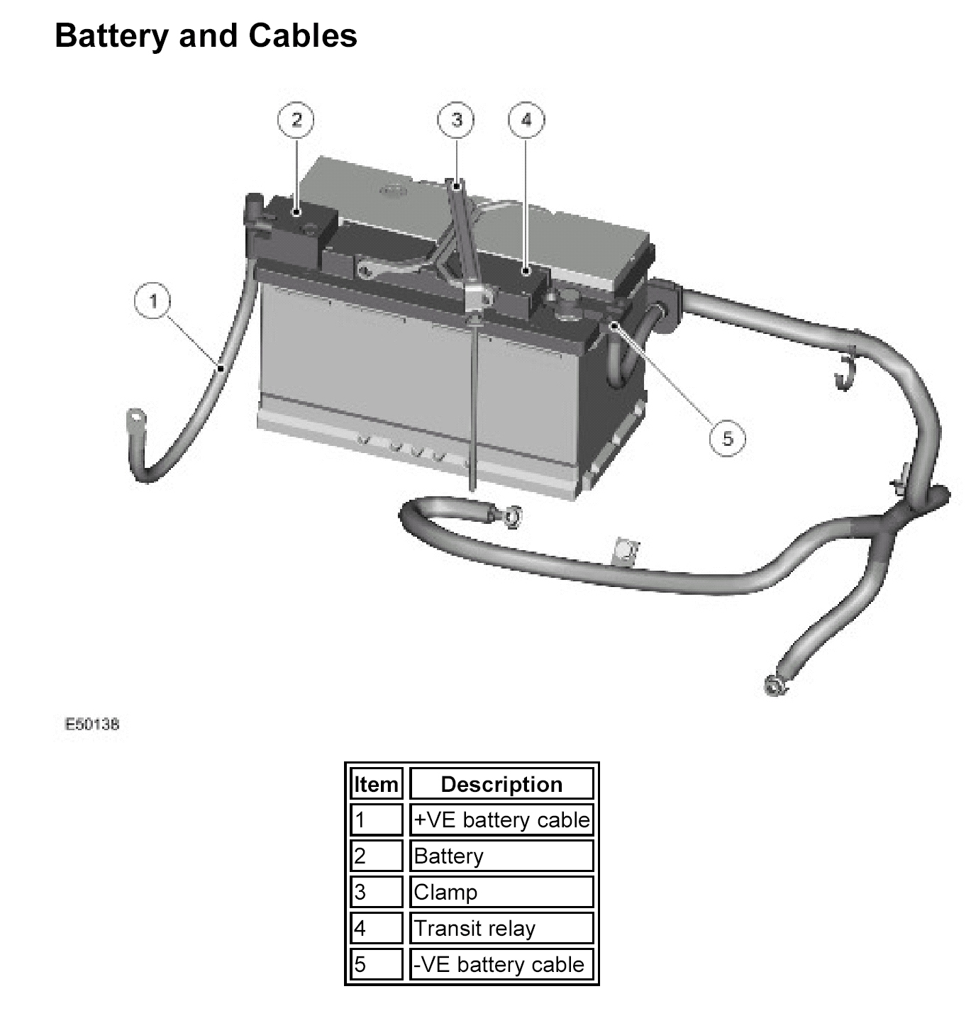 The battery terminal posts allow for the battery cables to be connected with clamp type connections. The battery positive terminal uses a pyrotechnic attachment, which detaches the battery cable in the event of a crash of a severity to trigger the airbags. For additional information, refer to Restraint Systems.