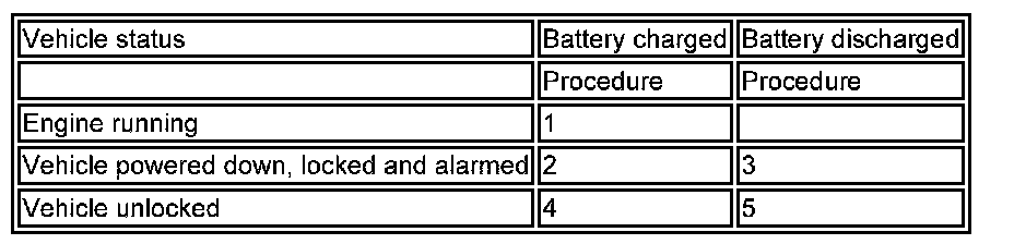 CAUTION: The vehicle status and battery condition must be established before attempting battery disconnect/connect. Reference must be then made to the following table to establish the relevant procedure to be followed.